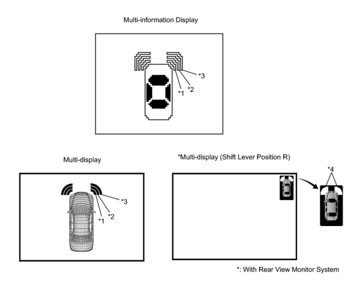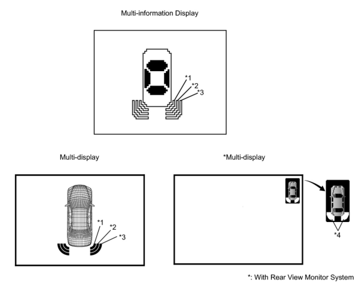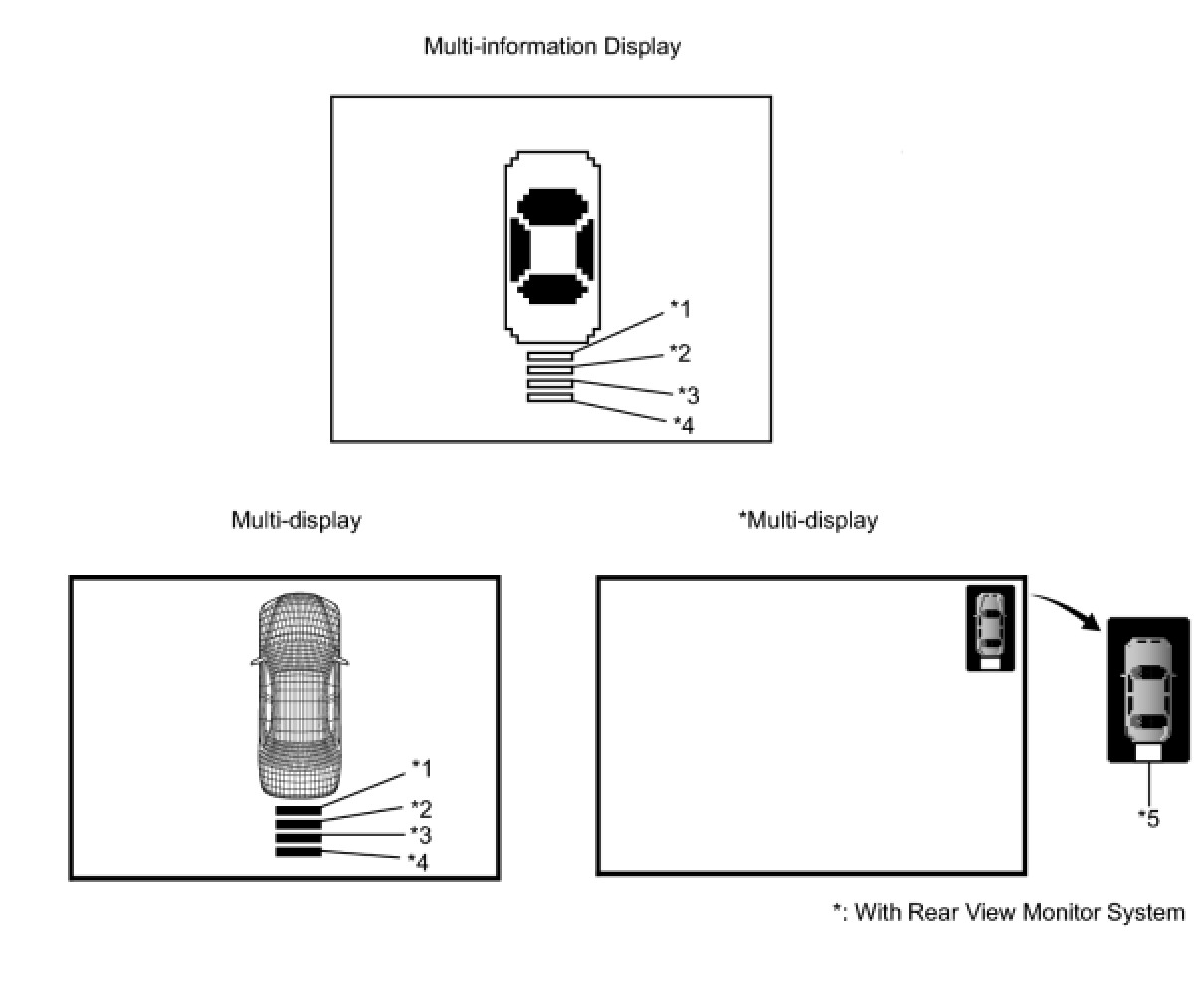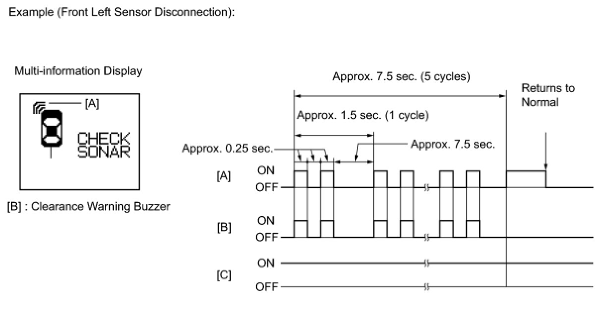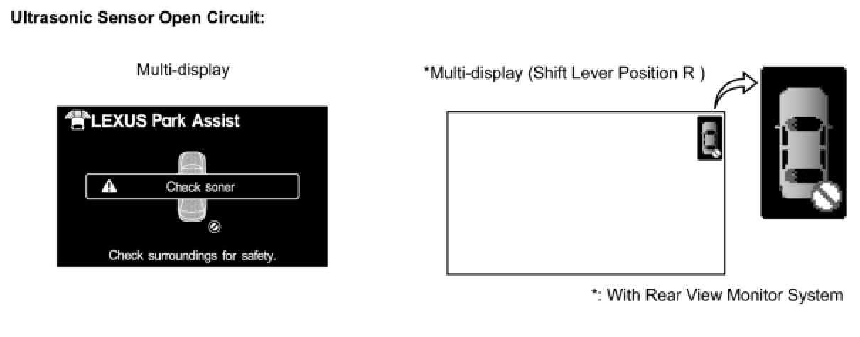 (1) If there is an open circuit between the ultrasonic sensor and the clearance warning ECU or a sensor is malfunctioning, the malfunction is displayed as shown in the illustration.