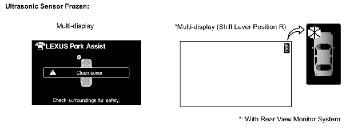- If a sensor has an open circuit or a sensor's detection operation malfunctions because it is wet or frozen, a malfunction display is shown in the multi-information display or multi-display, and the buzzer sounds.
