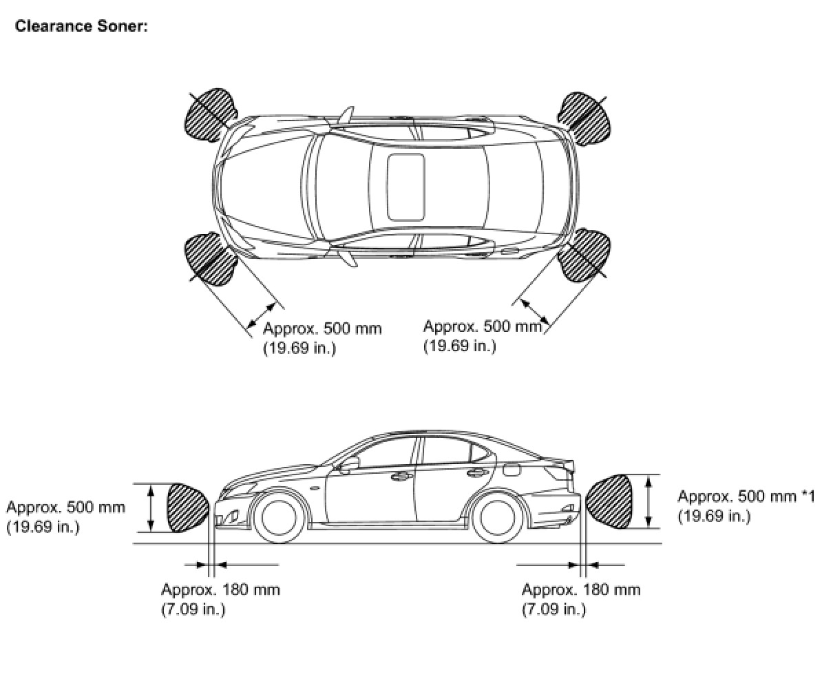 - The No. 1 ultrasonic sensor side view detection range's hatched area (labeled *1) represents the cross section of the top view detection range's A lines. The hatched area (*1) does not represent the entire side view detection range.