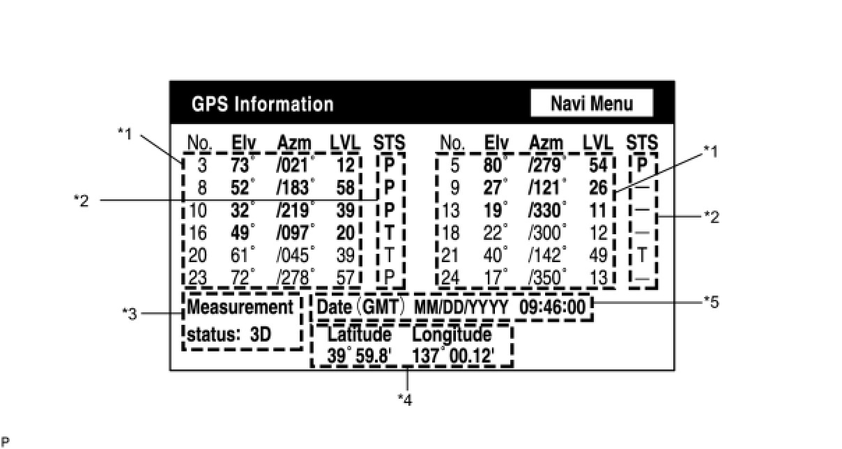 Information from a maximum of 12 satellites is displayed on the screen. This information includes the target GPS satellite number, elevation angle, direction, and signal level.