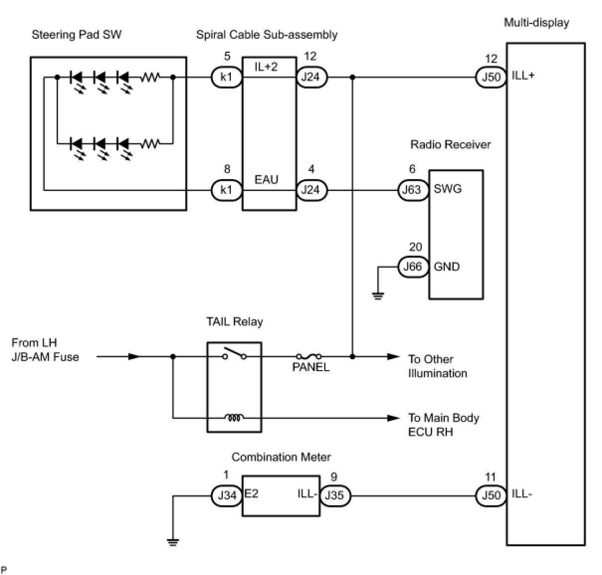 Power is supplied to the multi-display and steering pad switch assembly illumination when the light control switch is in the TAIL or HEAD position.