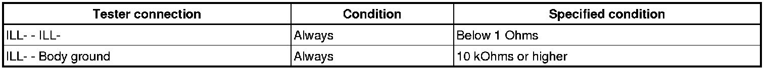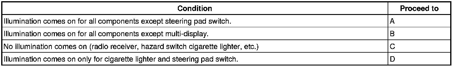 (a) Check if the illumination for the multi-display, steering pad switch assembly, cigarette lighter, or others (seat heater switch, hazard switch, etc.) comes on when the light control switch is turned to the HEAD or TAIL position.