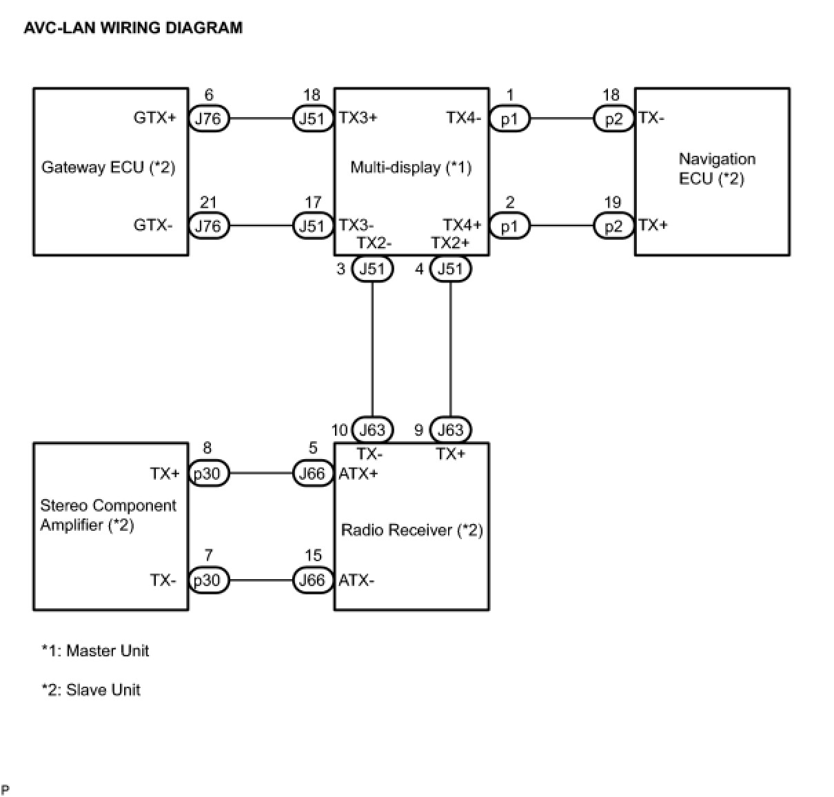 (a) Referring to the AVC-LAN wiring diagram below, check the AVC-LAN circuit between the stereo component amplifier and the component shown by the sub-code.