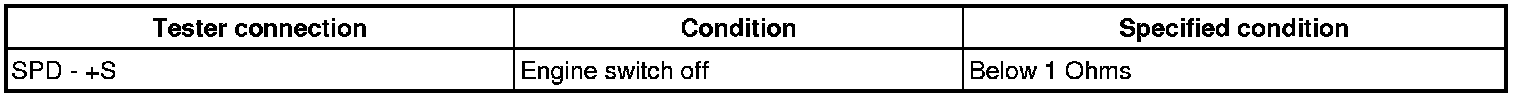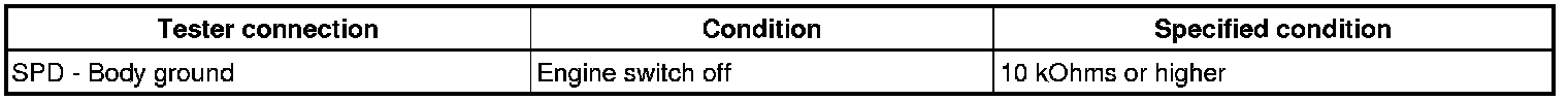 If the resistance between terminal SPD and body ground is less than 10 kOhms, there may be a short in a wire harness, connector, or an ECU that is connected to the SPD signal wire.