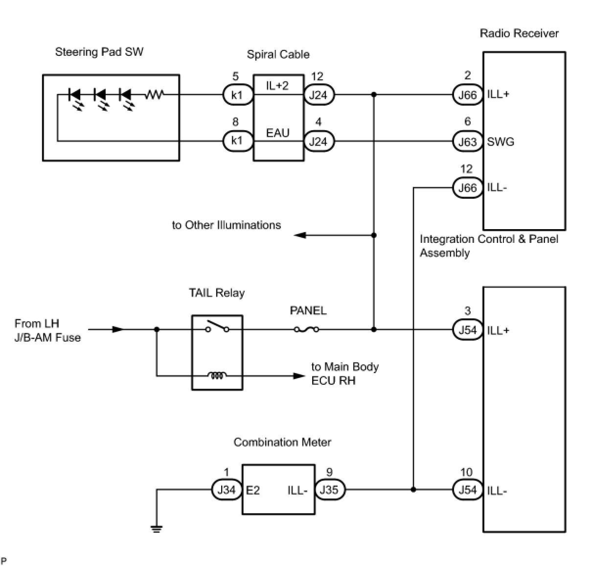 Power is supplied to the radio receiver, integration control & panel assembly and steering pad switch assembly illumination when the light control switch is in the TAIL or HEAD position.