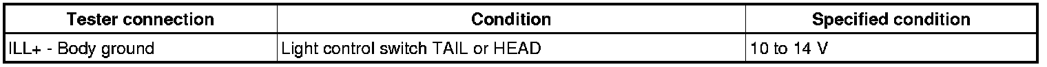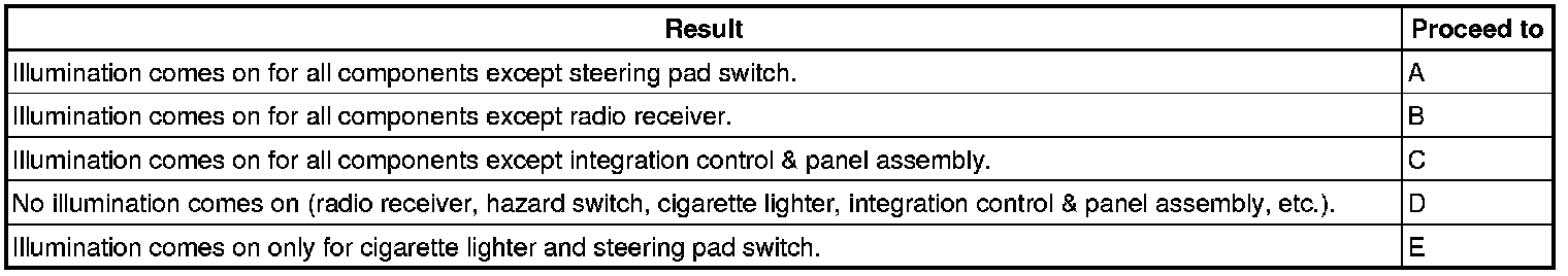 (a) Check if the illumination for the radio receiver, steering pad switch, integration control & panel assembly, cigarette lighter or others (seat heater switch, hazard switch, etc.) comes on when the light control switch is turned to the HEAD or TAIL position.