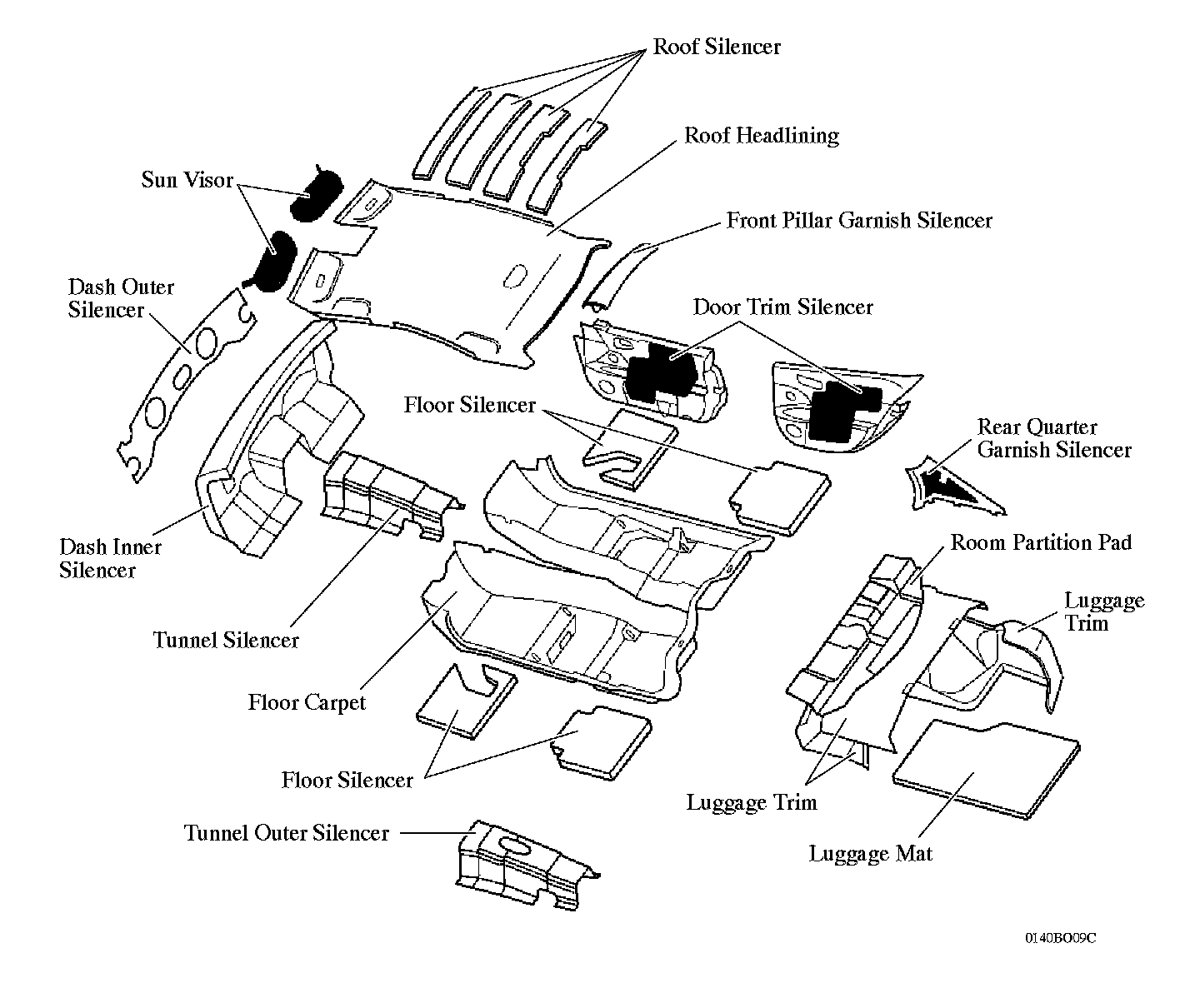 ^ Noise absorption and insulating materials have been optimally placed in consideration of the distribution of noise entering from outside the vehicle, and with the vehicle interior acoustic characteristics to achieve both quietness and weight savings.