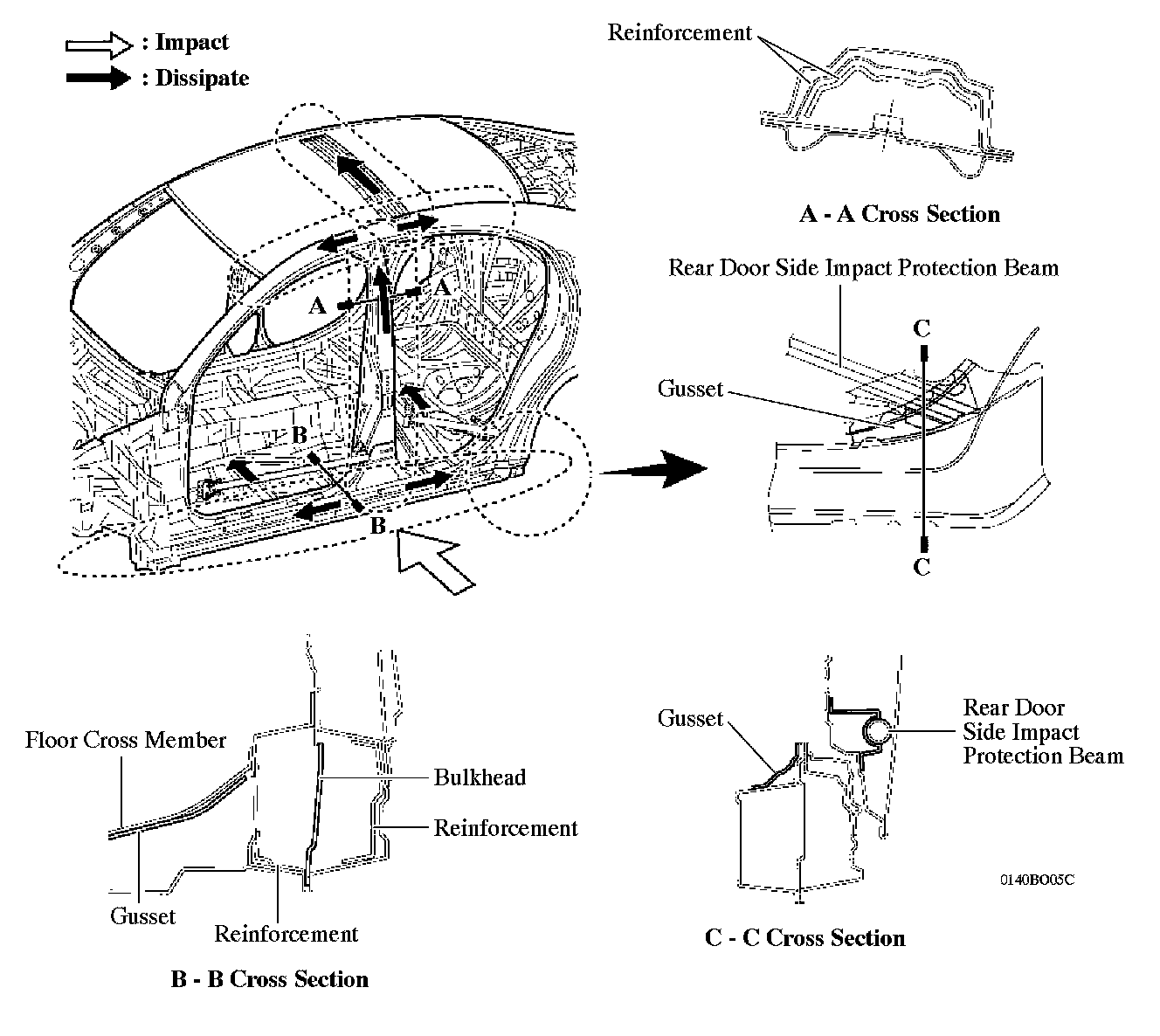 Impact energy of a side collision directed to the cabin area is dispersed throughout the body via pillar reinforcements, side impact protection beams, and floor cross members, thus helping minimize the impact energy finally directed to the cabin.