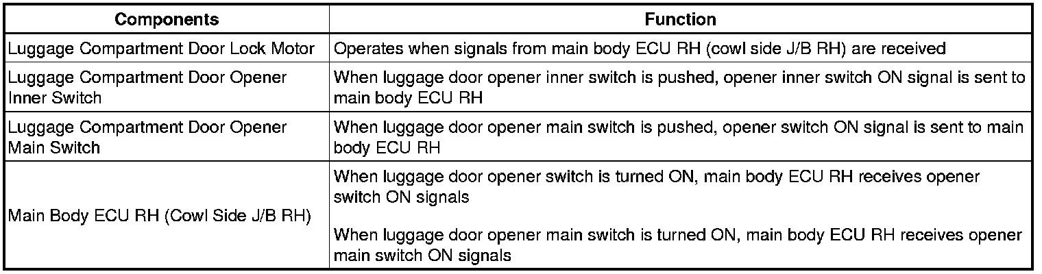 (b) The main body ECU RH (cowl side J/B RH) activates the luggage compartment door lock motor when the ON signal from the luggage compartment door opener inner switch is received.