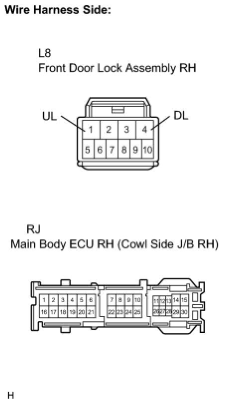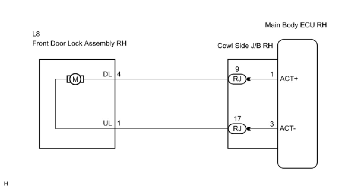 The main body ECU RH controls the front passenger door lock motor to lock/unlock the front passenger door. This ECU applies current from terminal ACT+ to terminal ACT- to operate the motor to lock the door. It reverses the direction of the current flow to operate the motor to unlock the door.