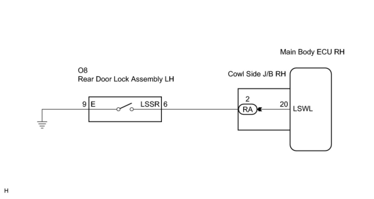 The main body ECU RH is connected to the rear left side door lock assembly via terminal LSWL and rear left side door lock/unlock state signals are input to the ECU.