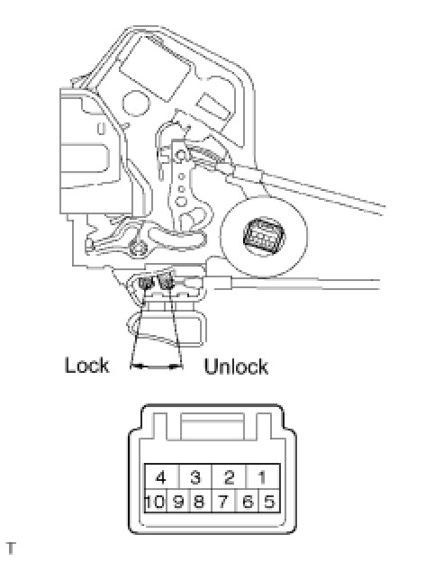 The main body ECU RH applies voltage to the door unlock detection switch via terminal LSWL. When the door unlock detection switch is on (there is continuity between the switch terminals), a lock state signal is input to the ECU. When the switch is off (there is no continuity between the switch terminals), an unlock state signal is input.