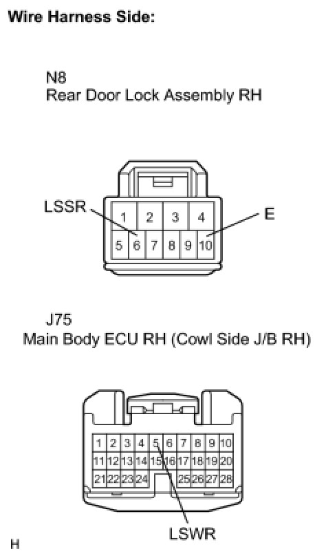 The main body ECU RH is connected to the rear right side door lock assembly via terminal LSWR and rear right side door lock/unlock state signals are input to the ECU.
