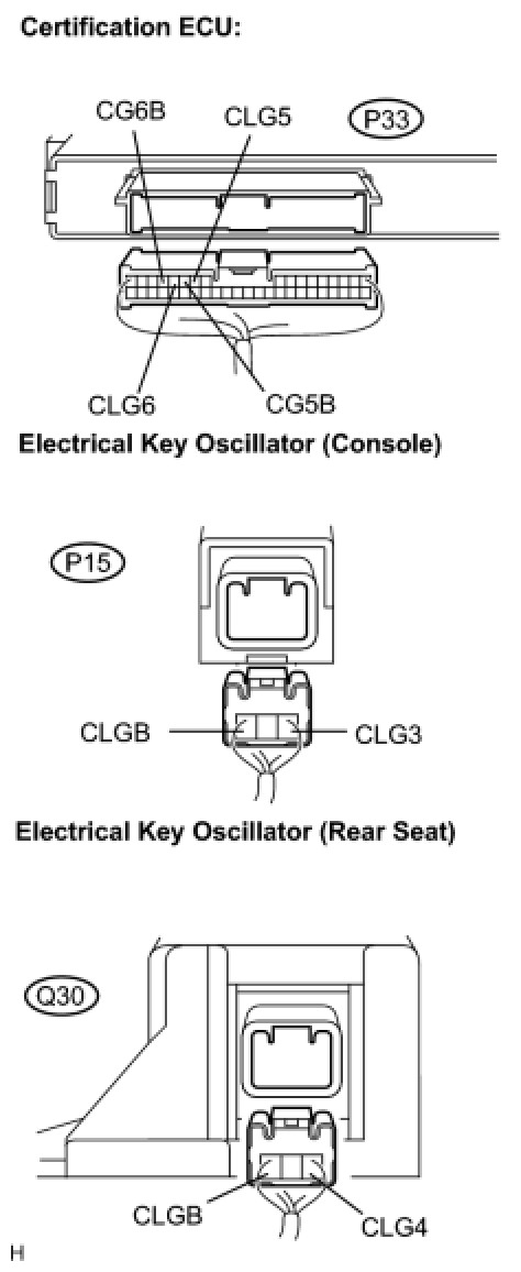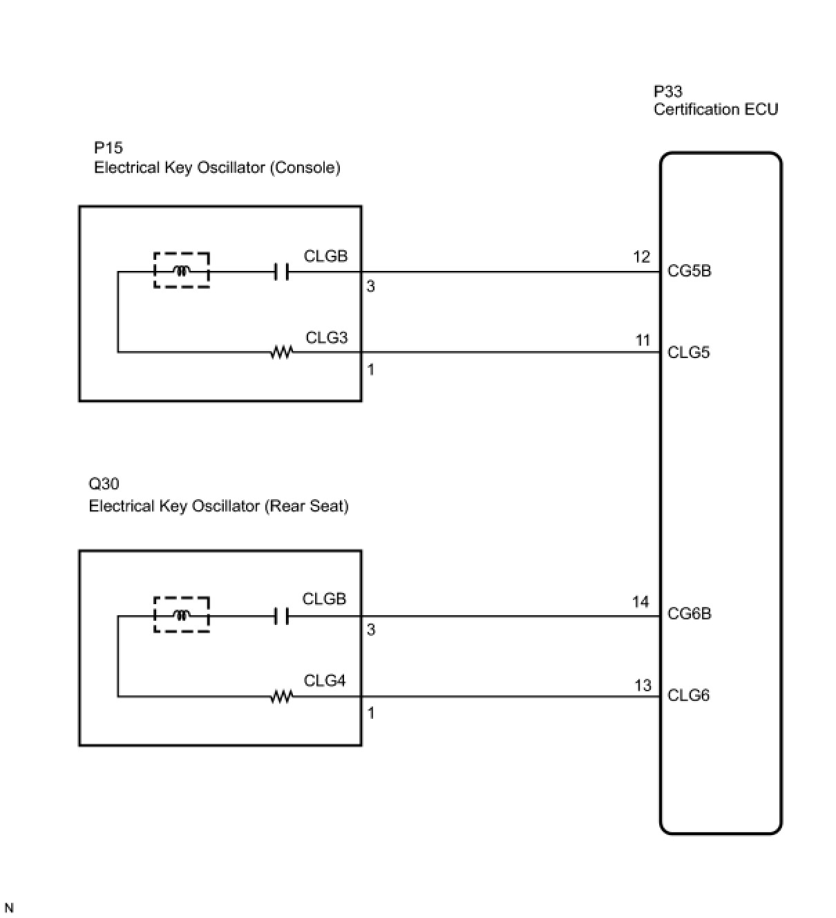 The certification ECU activates the front and rear cabin oscillators. The power is supplied from the certification ECU to both the front and rear cabin oscillators. The front and rear cabin oscillator circuits have the same wiring. If the smart access system with push-button start does not operate properly inside the vehicle, check the circuit for their oscillators.