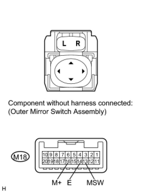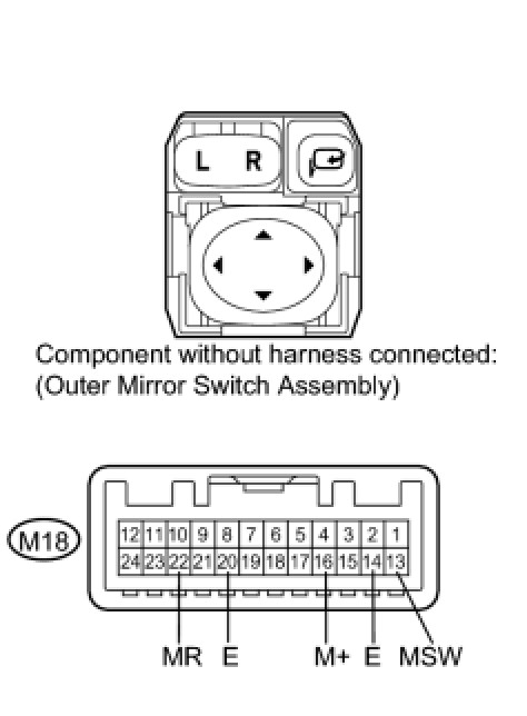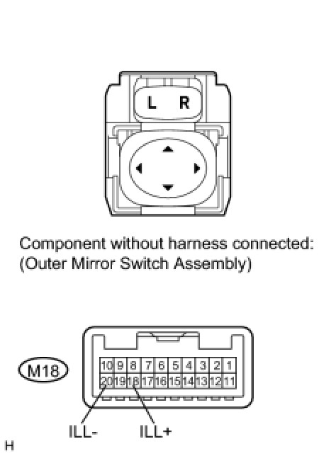 (1) Apply battery voltage to the outer mirror switch assembly and check that the LED illuminates.