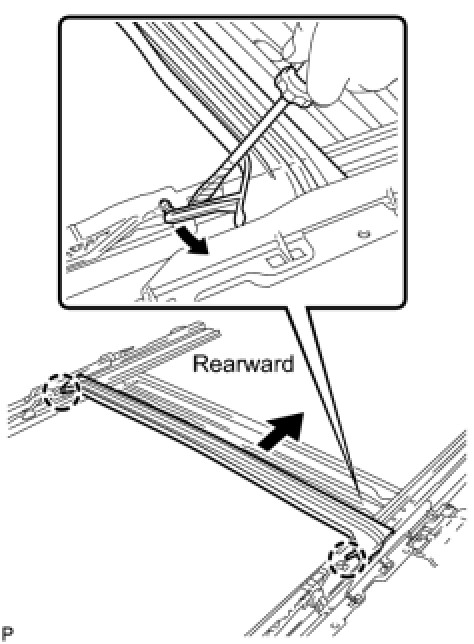 (b) Using a screwdriver, disengage the 2 claws. Then slide the sliding roof drip channel rearward to remove it.