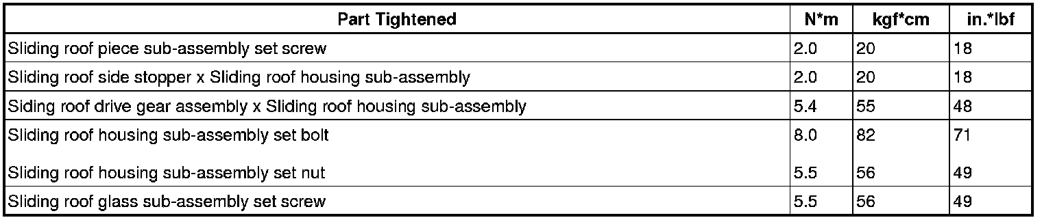 SERVICE SPECIFICATIONS: SLIDING ROOF: TORQUE SPECIFICATIONS