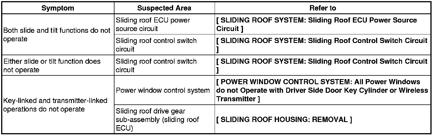 SLIDING ROOF: SLIDING ROOF SYSTEM: PROBLEM SYMPTOMS TABLE