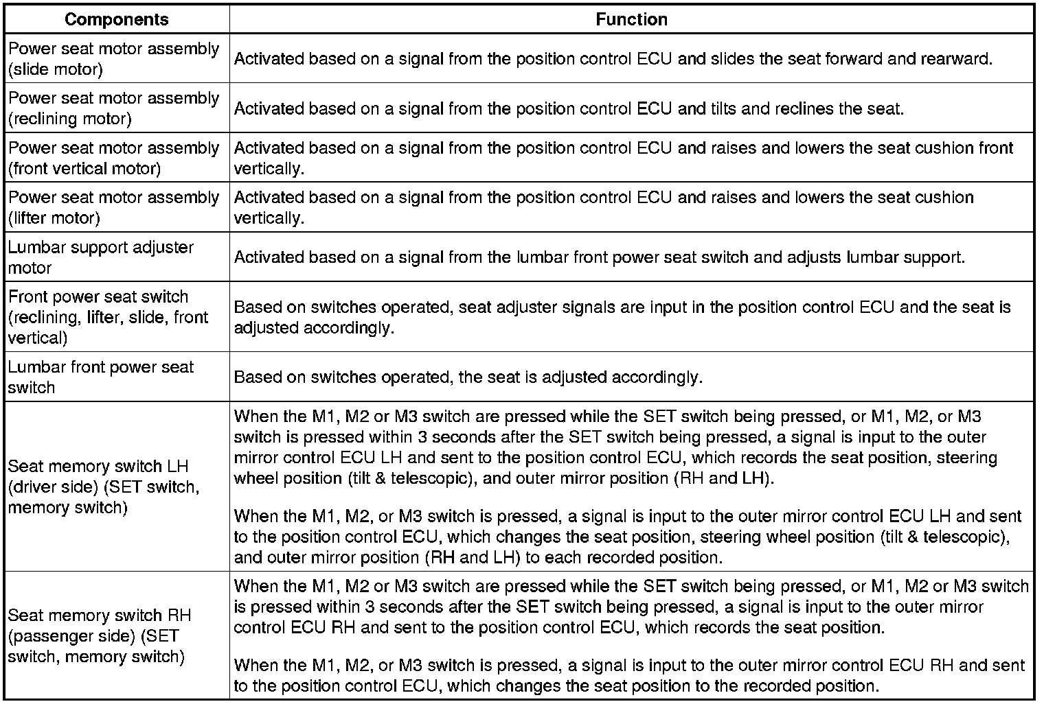 SEAT: FRONT POWER SEAT CONTROL SYSTEM (w/ Seat Position Memory System): SYSTEM DESCRIPTION