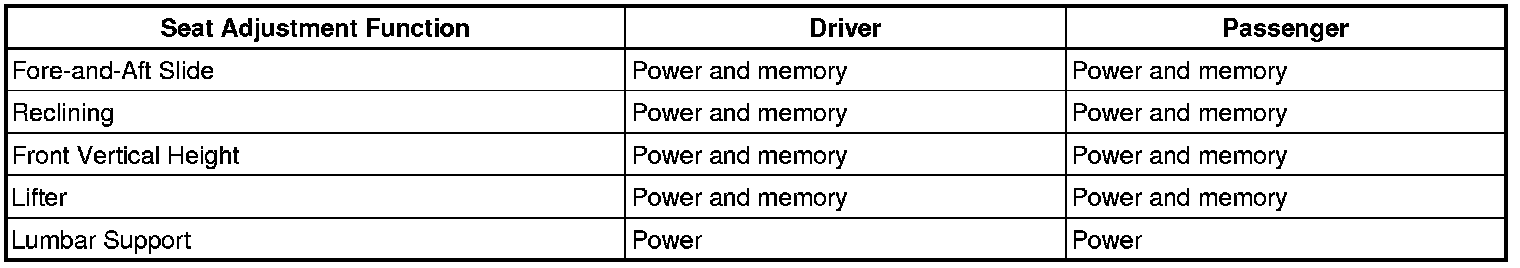 - The driver seat and front passenger seat are equipped with slide, reclining, lifter, front vertical, and lumbar support adjustment functions.
