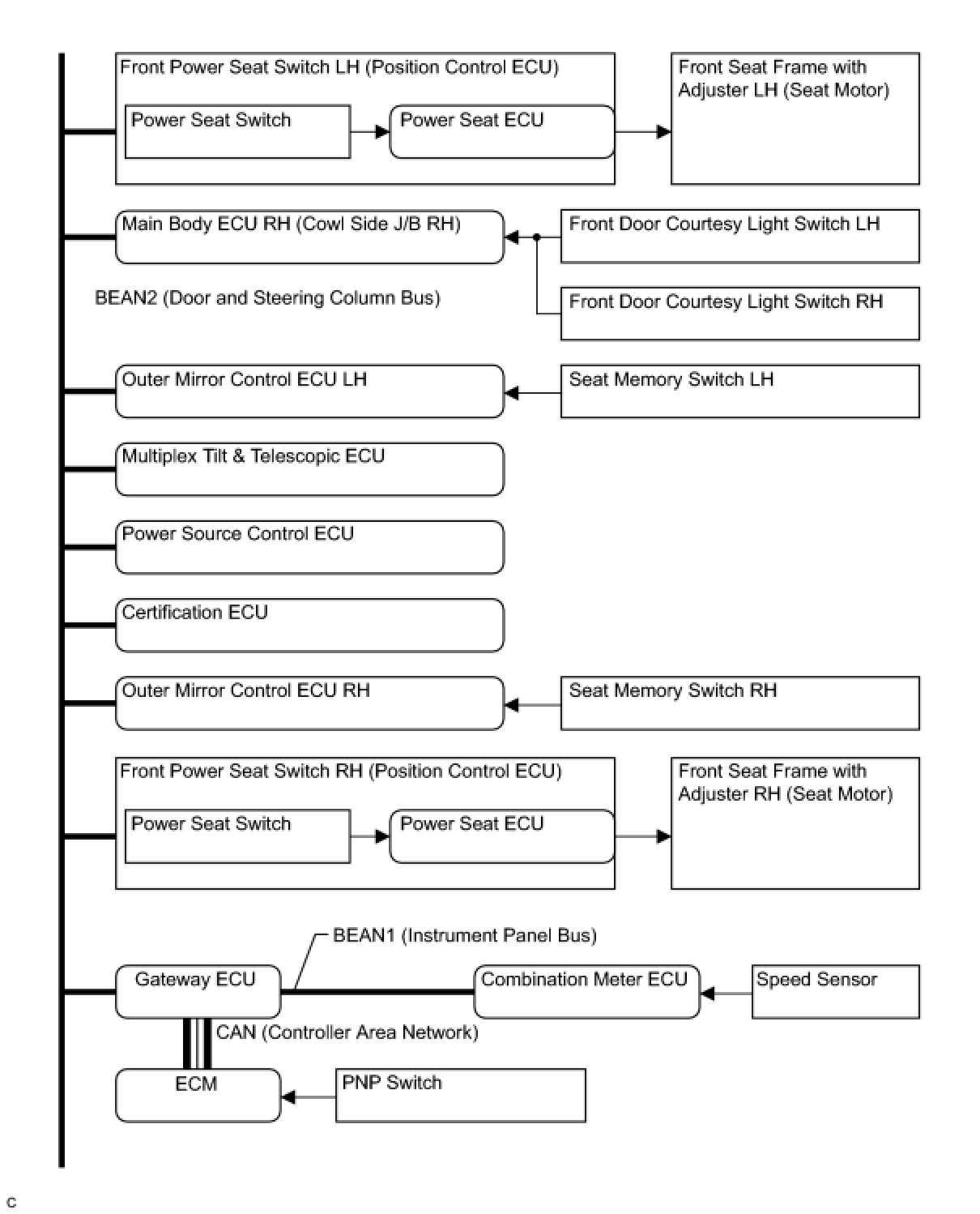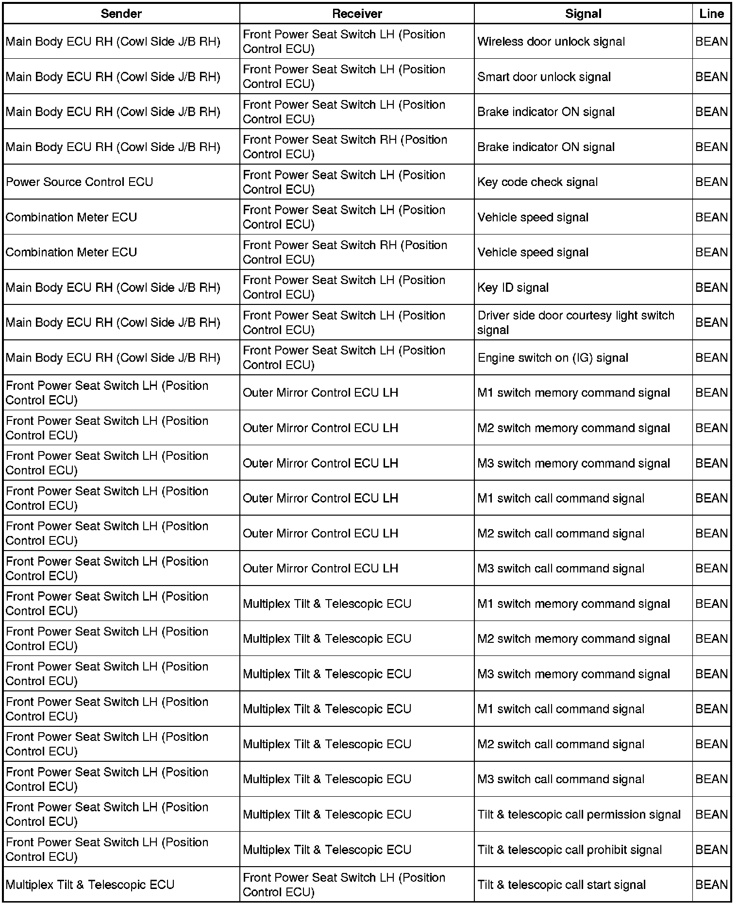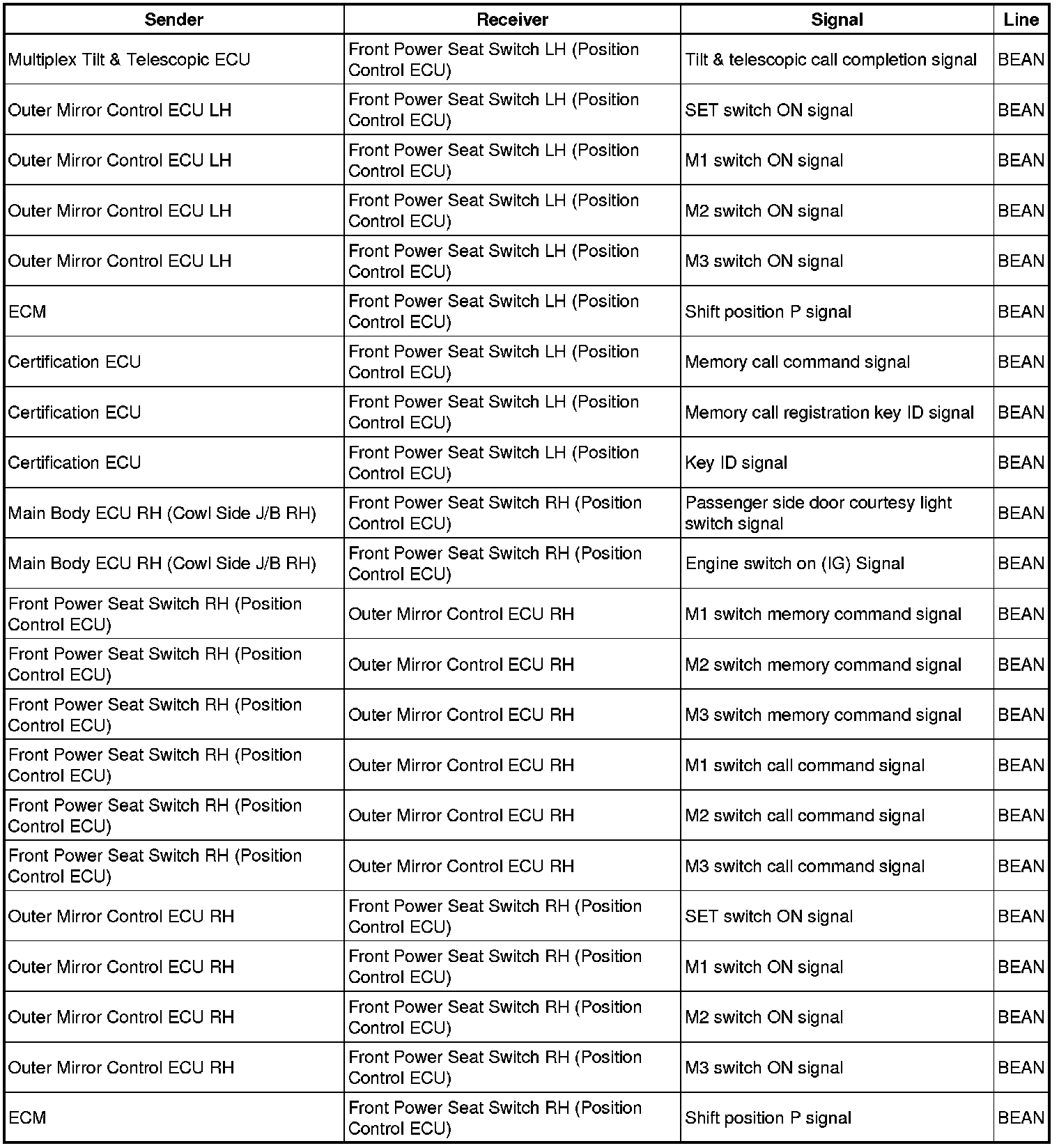 - For the driver side memory function, the memory switch operation is first transferred from the outer mirror control ECU LH to the front power seat switch LH (position control ECU) via the multiplex communication line. For the passenger side memory function, memory switch operation is first transferred from the outer mirror control ECU RH to the front power seat switch RH (position control ECU) via the multiplex communication line. Then, either the seat position is stored in memory or a previously stored seat position is recalled.