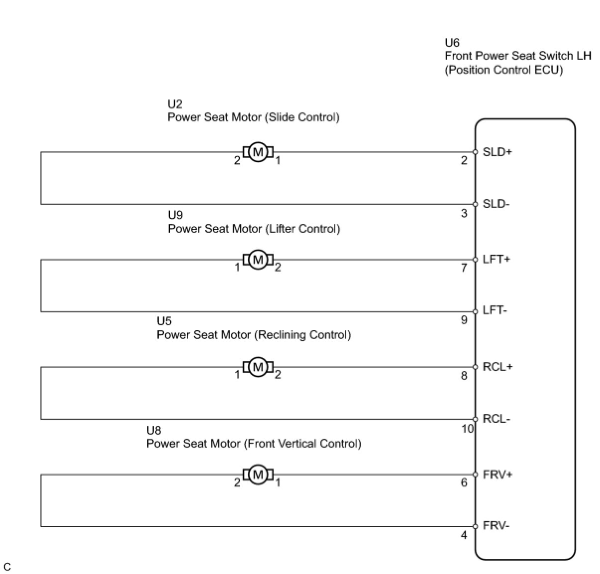 If the front power seat switch LH (position control ECU) detects a low motor speed, abnormal activity, or sudden motor current fluctuation, the system will stop the motor. If the motor operates continuously for 120 seconds or more, the system will stop the motor until the switch is turned on again.