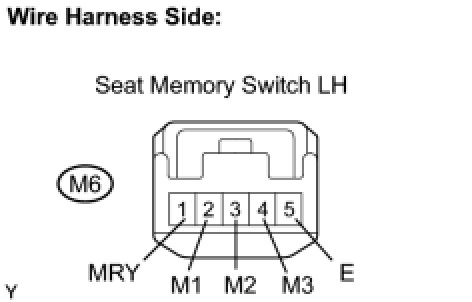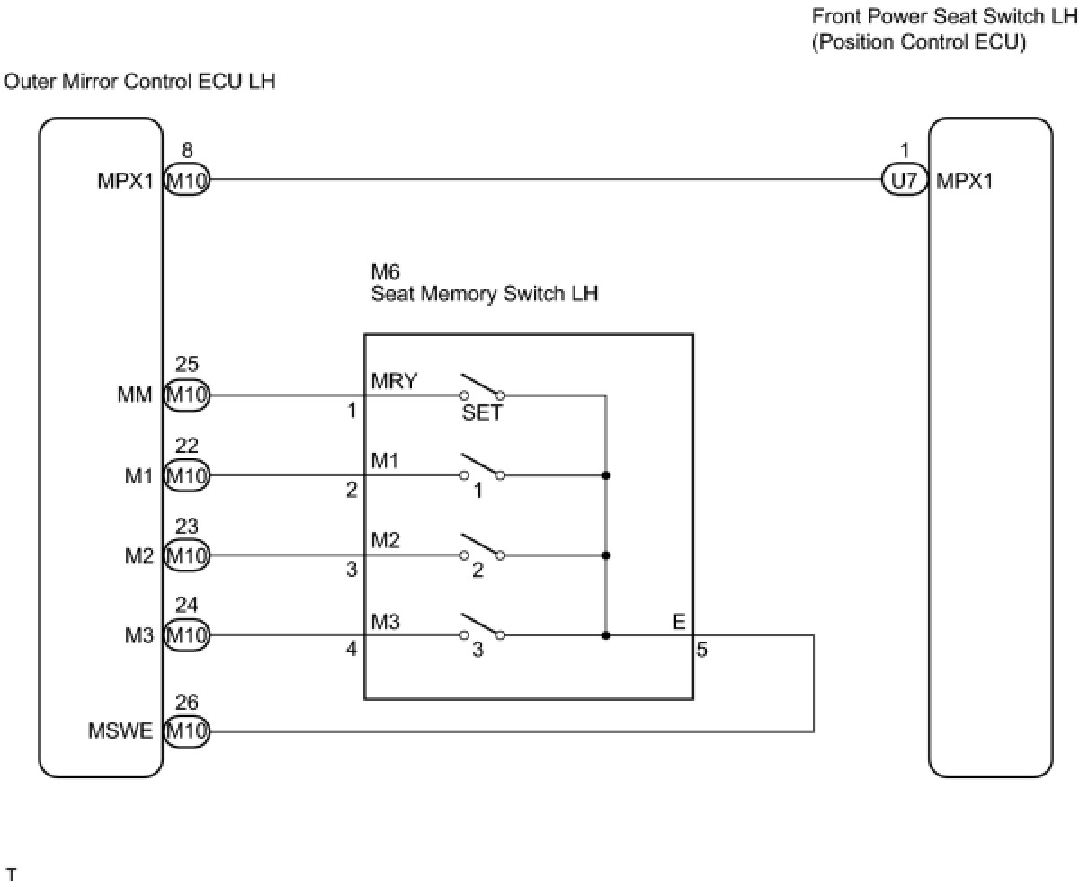 The seat memory switch LH sends signals to the front power seat switch (position control ECU) via the multiplex communication system to memorize a given seat position. This memory system does not use a position sensor. The seat position is detected by counting pulses that are output when the motor turns. If there is no pulse output from the motor, the motor will stop operating. The seat memory switch LH is later used to send signals to the front power seat switch LH (position control ECU) to return the seat to one of the memorized positions.