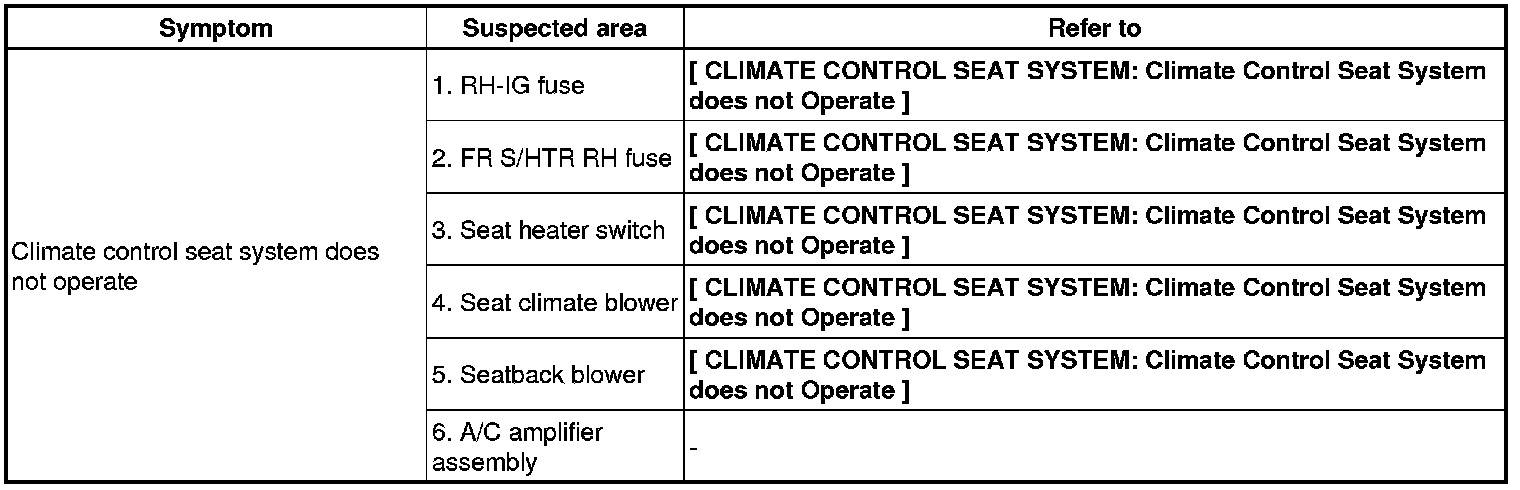 SEAT: CLIMATE CONTROL SEAT SYSTEM: PROBLEM SYMPTOMS TABLE