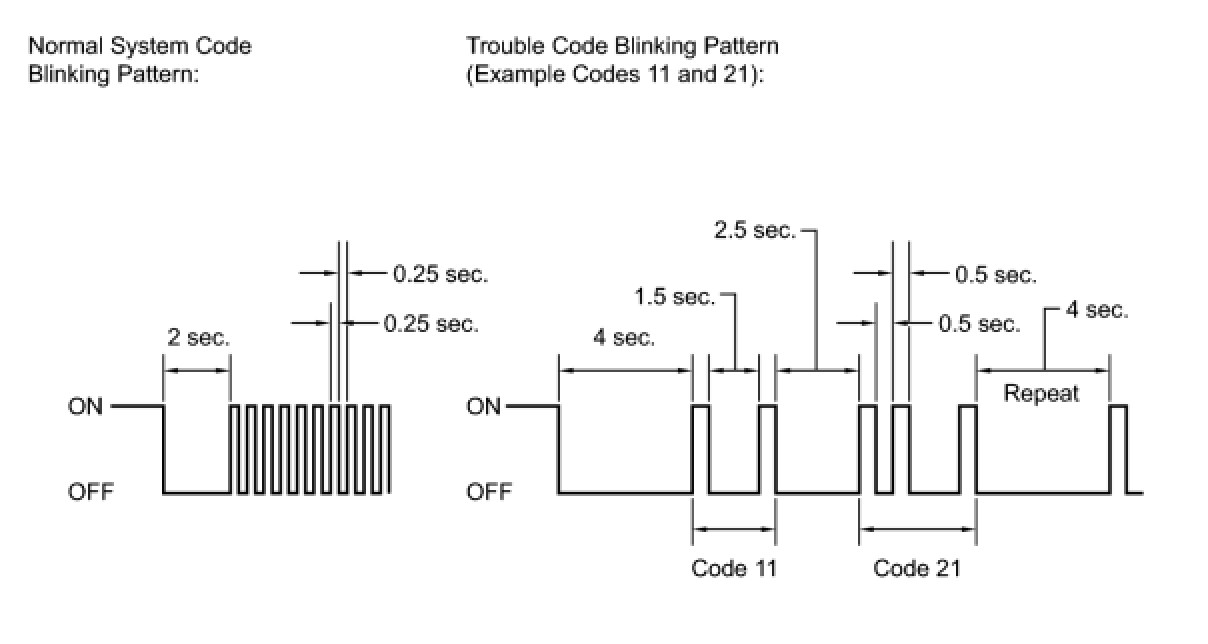 (4) As an example, the illustration below shows the blinking patterns of the normal system code and trouble codes 11 and 21 for the ABS warning and slip indicator lights.