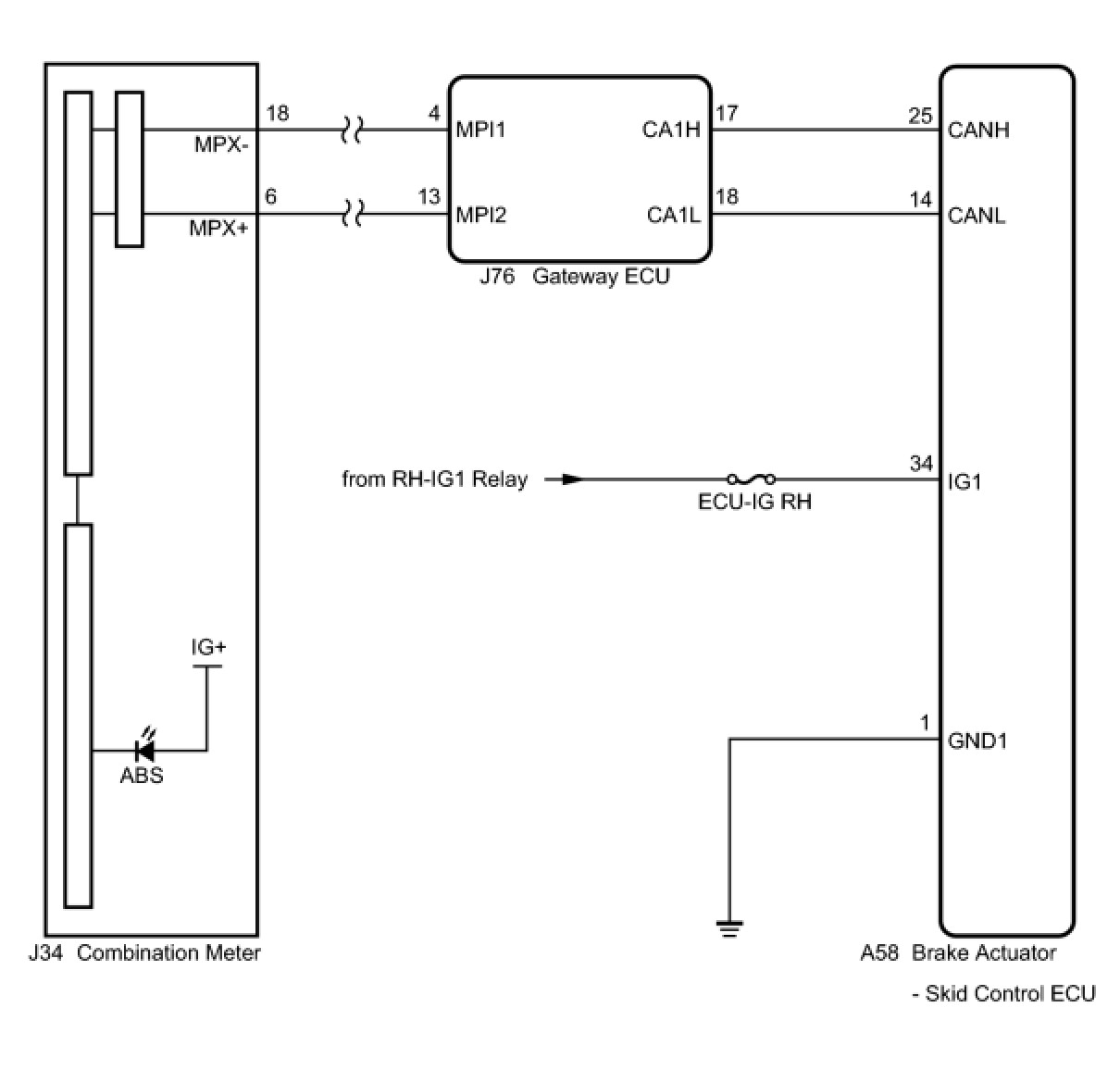 The skid control ECU is connected to the combination meter via the CAN and multiplex communication systems.