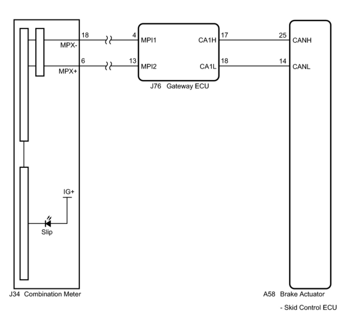 The skid control ECU is connected to the combination meter via the CAN and multiplex communication systems.