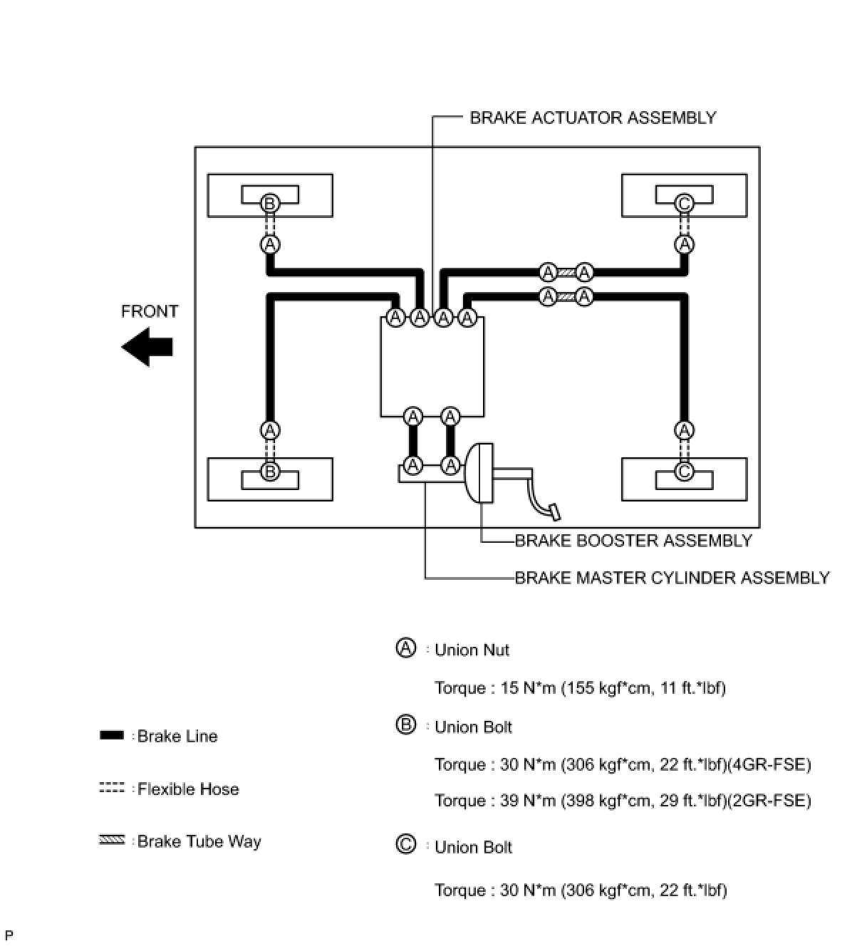 See the layout drawing to confirm the locations and tightening torque of flexible hoses and brake lines.