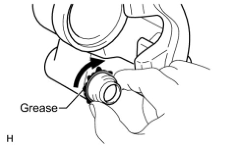 Apply a sufficient amount of lithium soap base glycol grease to the entire circumference of the rear brake bushing dust boot and rear disc brake cylinder assembly contact surfaces.