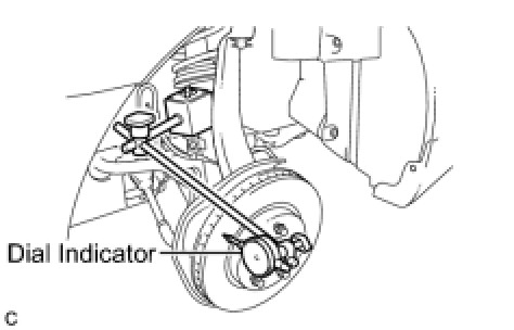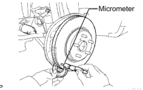 (c) If the runout exceeds the maximum value, change the installation positions of the disc and axle so that the runout will become minimal. If the runout exceeds the maximum even when the installation positions are changed, check the bearing play in the axial direction and the axle hub runout Front Axle Hub. If they are normal, and if the disc thickness is not within the specified range, grind the disc. If the disc thickness is less than the minimum, replace the disc.