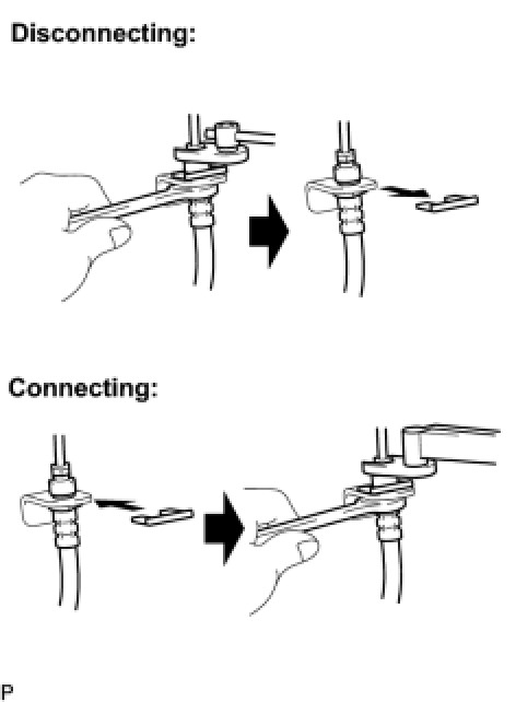 1 Hold the flexible hose with a wrench and disconnect the brake tube with a union nut wrench without deforming the tube.