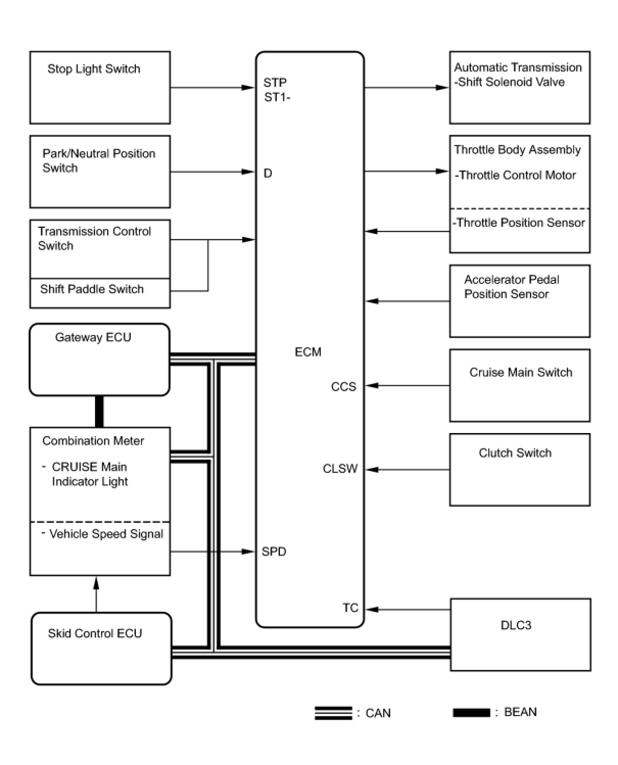 - The ECM cancels the cruise control system when the clutch pedal is depressed and the ECM receives a clutch switch signal (for Manual Transaxle).