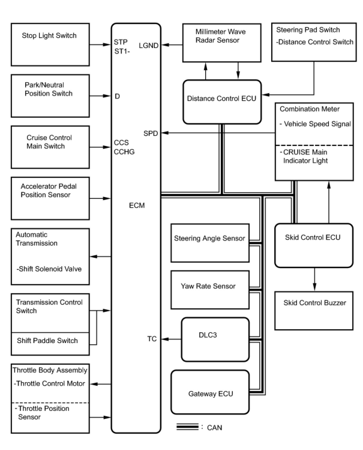 (d) The millimeter wave radar sensor and the distance control ECU control the system while the vehicle-to-vehicle distance control mode is in operation, and send signals to each actuator and ECU.