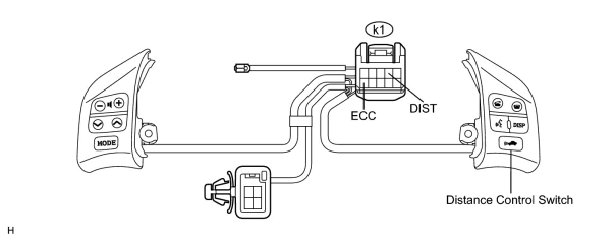 The distance control switch sets the vehicle-to-vehicle distance control mode. The distance control switch is installed in the steering pad switch. The vehicle-to-vehicle distance set value can be changed by operating the steering pad switch (distance control switch) while the dynamic radar cruise control system is in operation. The steering pad switch uses the BEAN to communicate with each ECU. Therefore, it does not have a direct connection with the ECM. If there are any malfunctions in the communication line of the steering pad switch, one or more DTCs in the multiplex communication system are output.