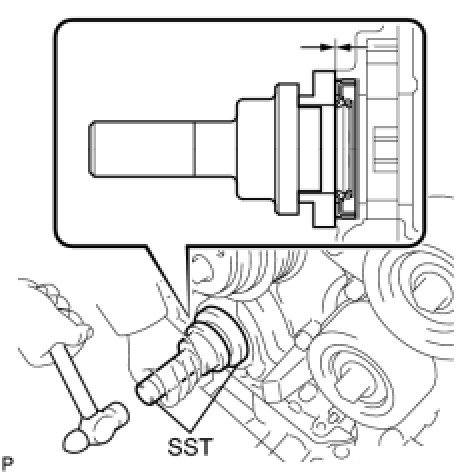 (b) Using SST and a hammer, tap in the oil seal until its surface is flush with the timing chain case edge.