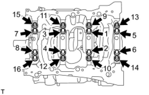 (1) Install and uniformly tighten the 16 main bearing cap bolts in the sequence shown in the illustration.