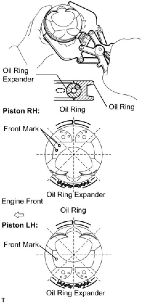 (b) Using a piston ring expander, install the oil ring rail as shown in the illustration.