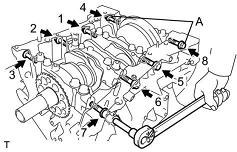 (l) Install 8 new seal washers and uniformly tighten the 8 main bearing cap bolts in several steps and in the sequence shown in the illustration.