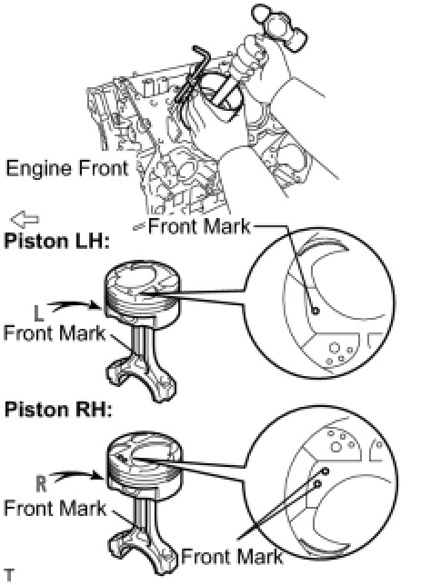 (d) Align the front marks of the piston and connecting rod, and push in the piston pin with your thumb.