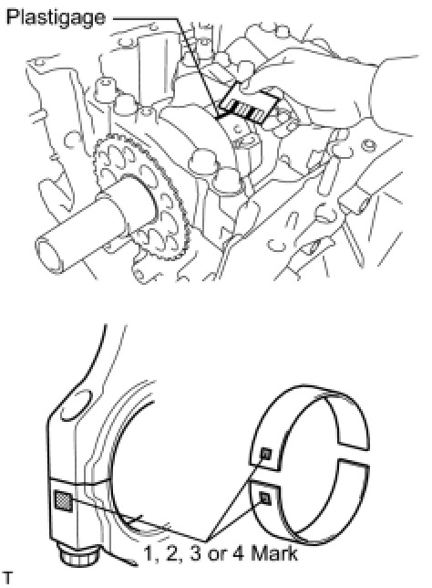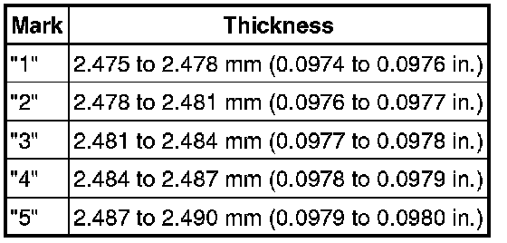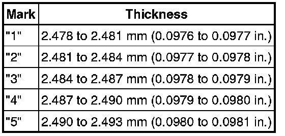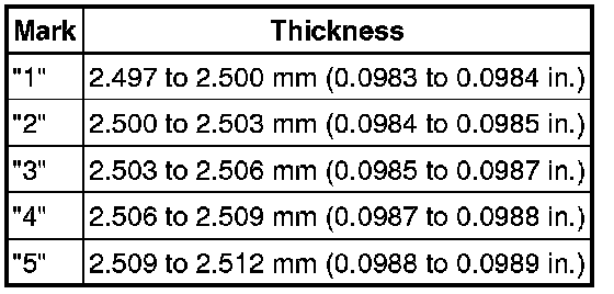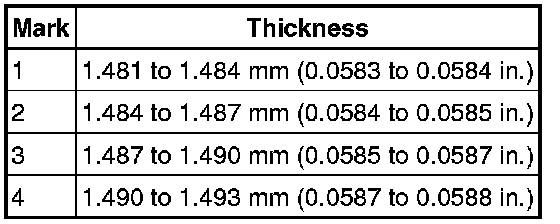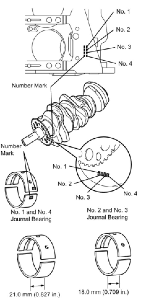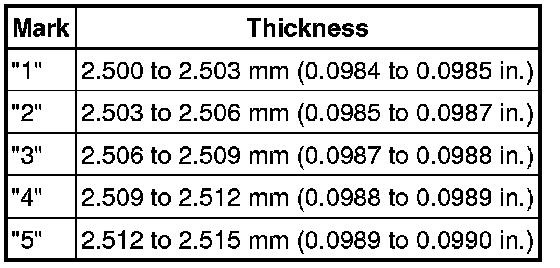 If replacing a bearing, replace it with one that has the same number as its respective connecting rod cap. Each bearing's standard thickness is indicated by a 1, 2, 3 and 4 mark on its surface.