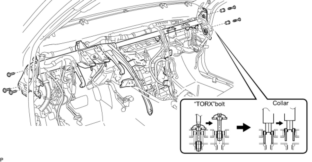 (f) Using a 12 mm hexagon wrench, remove the 2 collars and instrument panel reinforcement.
