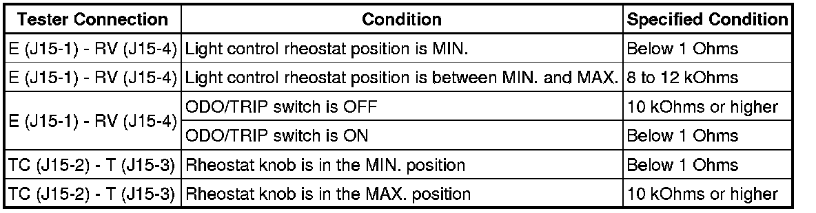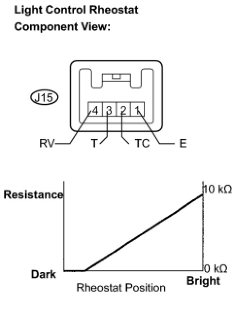 If the value is not as specified, replace the light control rheostat.