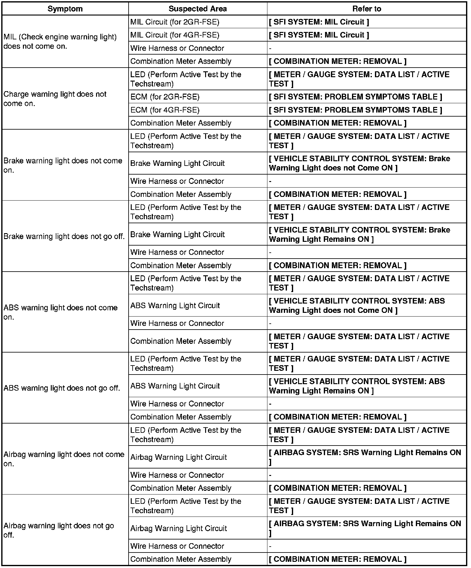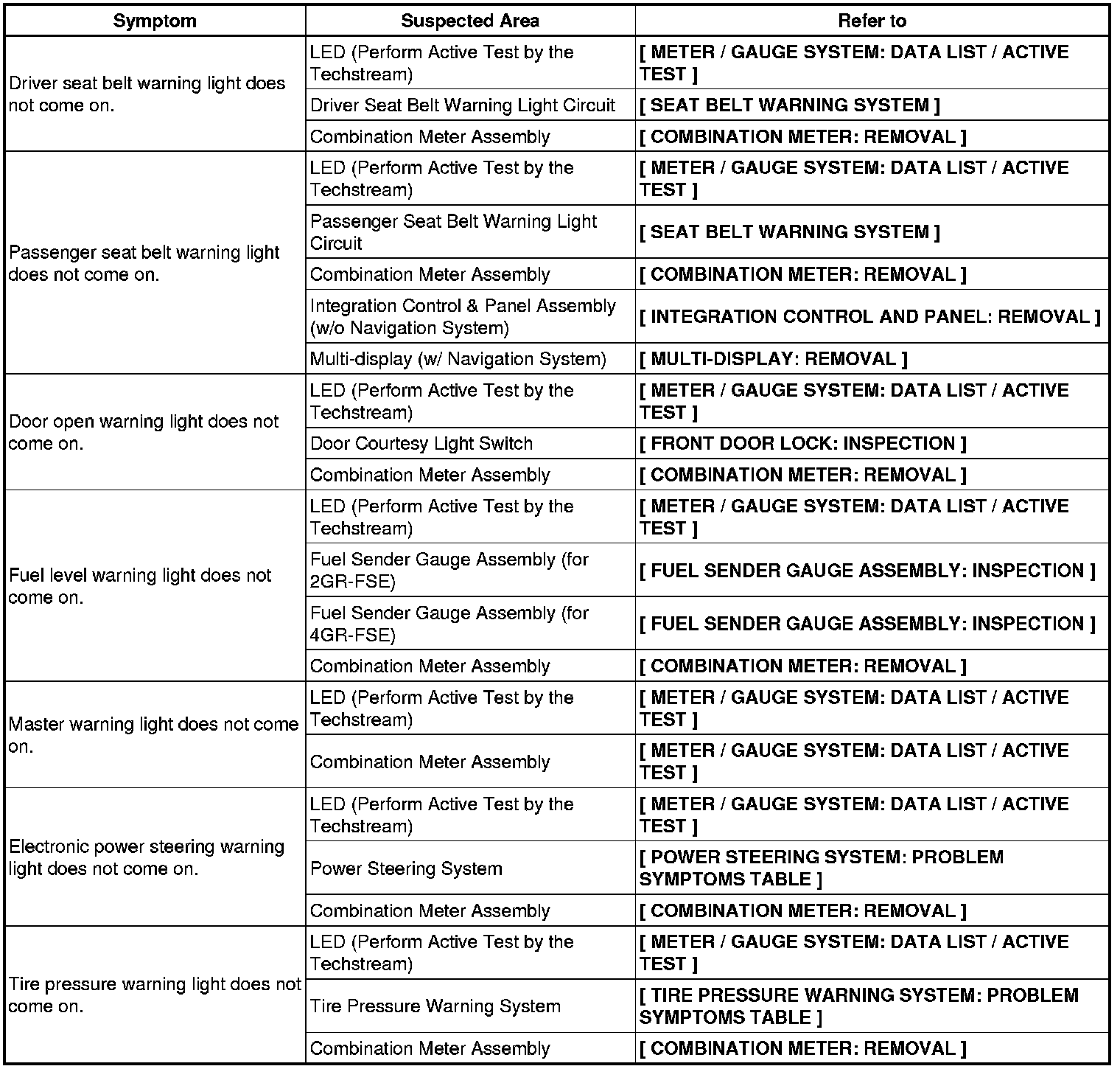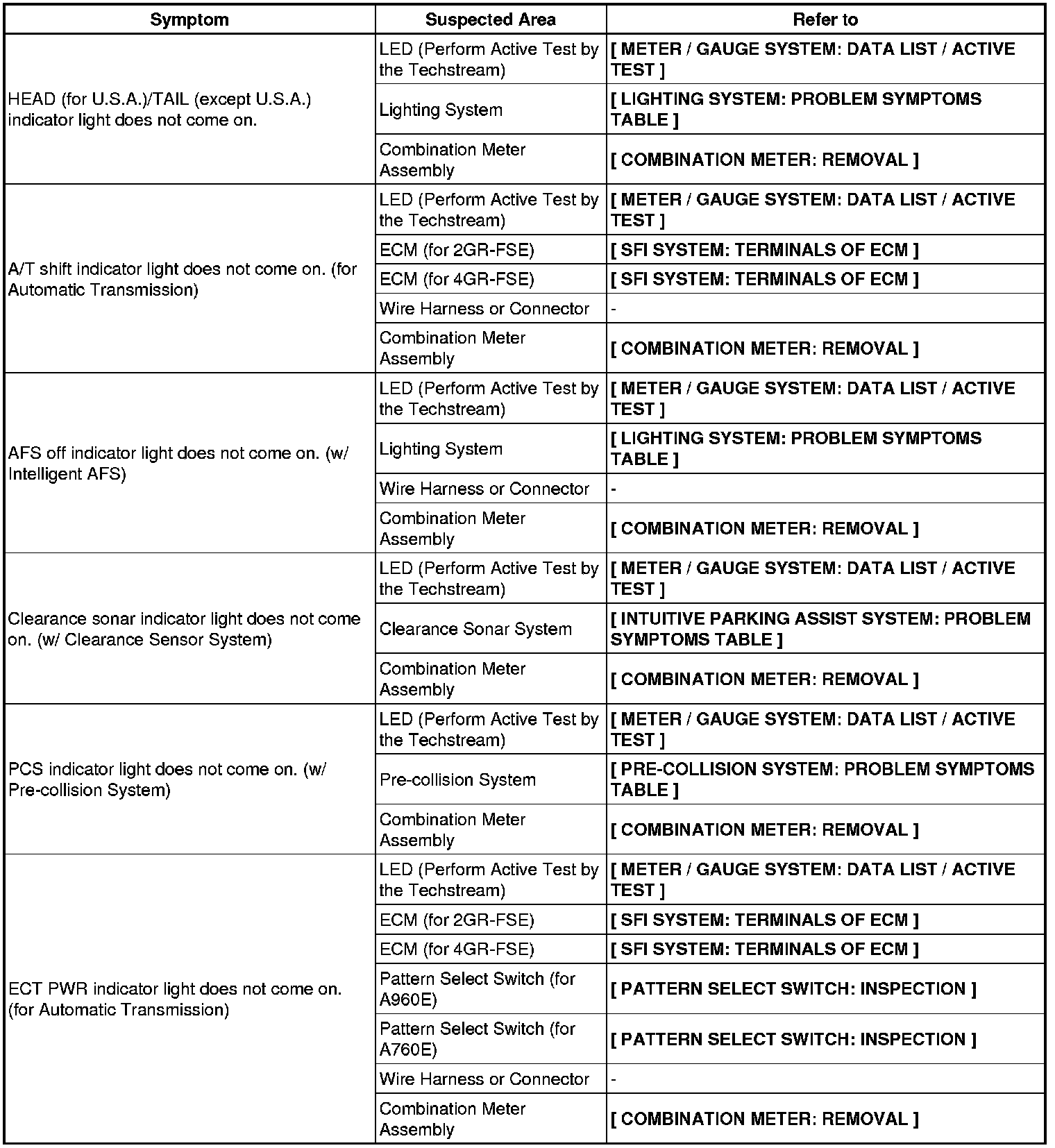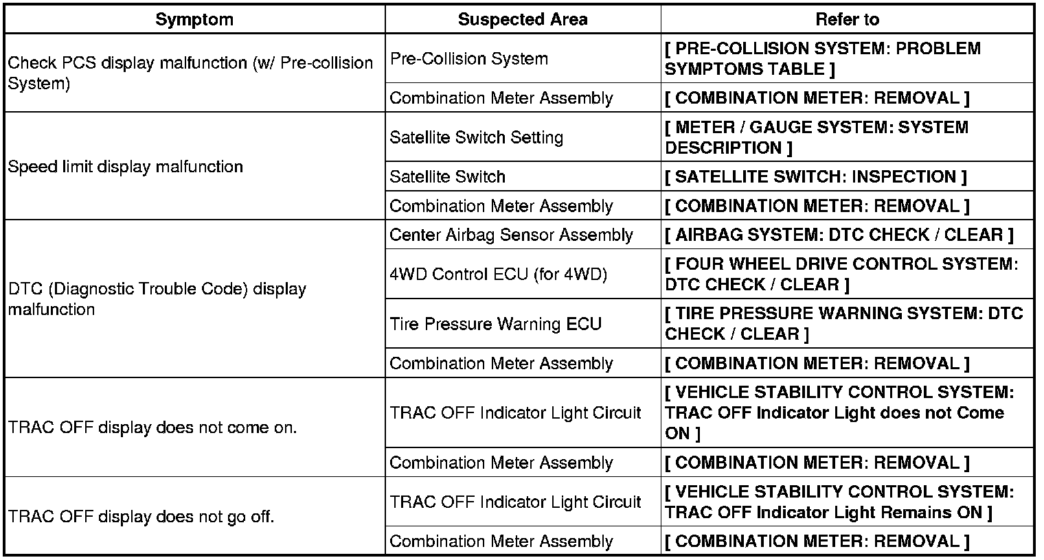METER: METER / GAUGE SYSTEM: PROBLEM SYMPTOMS TABLE