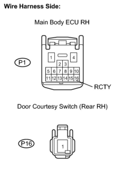 (b) Check the wire harness between the main body ECU RH and door courtesy switch (rear RH).