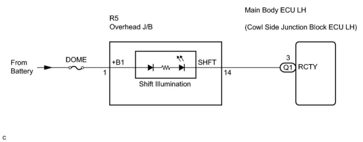 This MOS-FET circuit has an overheat protection function as a fail-safe. If the main body ECU LH becomes excessively hot, the shift illumination turns off and remains off.