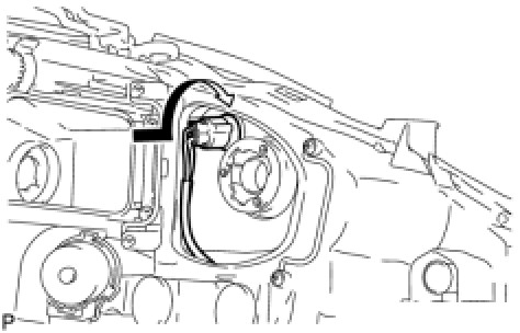 (b) Turn the 2 front turn signal light bulbs and headlight cord in the direction indicated by the arrow in the illustration and install them as a unit.